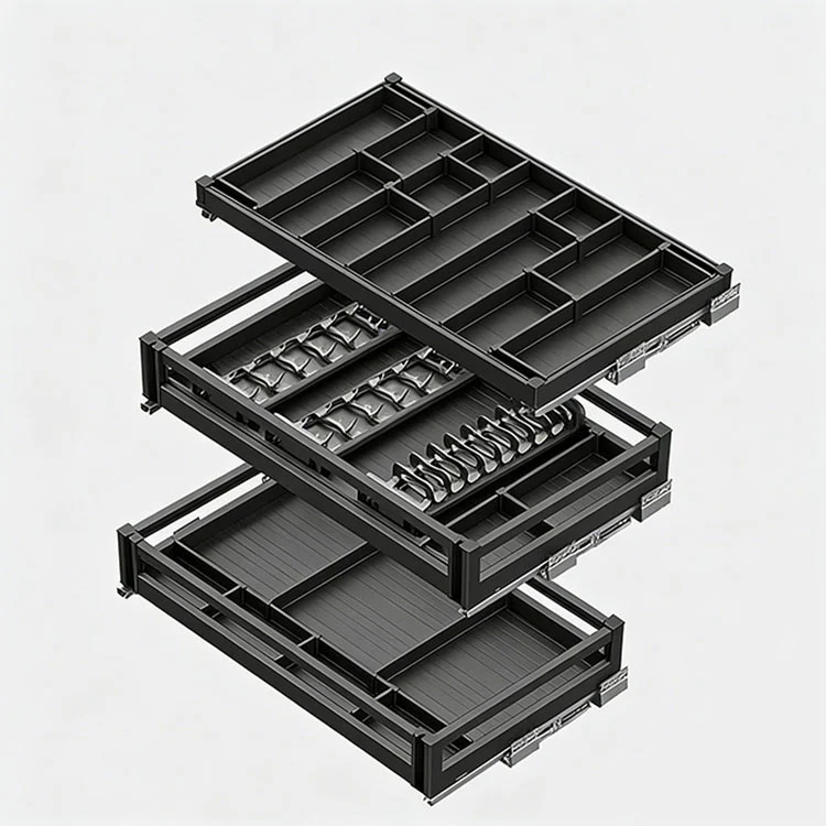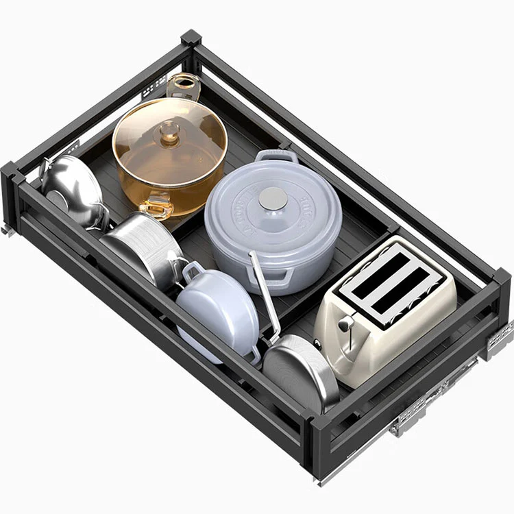 Бұл алюминий қорытпасынан шығарылатын себет негізінен ыдыс-аяқ, кәстрөлдер және дәмдеуіштер сияқты ас үй заттарын жіктеу үшін пайдаланылады. Бұл ас үй шкафының тартпасы заманауи асүйлерге арналған арнайы әзірленген кірістірілген сақтау шешімі болып табылады. Қабатты дизайн және практикалық функциялары бар, ол ішкі жадының шатастырылуы мен шкафтардағы бос орынды пайдалану мәселелерін оңай шешеді және ас үйді сақтауға тамаша көмекші болып табылады.