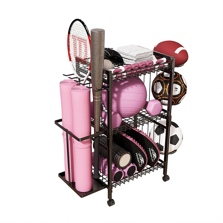 Бұл еденге арналған металл йога төсеніштерін сақтауға арналған сөреде үш қабат және екі бүйірлік сақтау жүйесі бар. Сол жағы дербес жобаланған, кеңістікті кеңейтеді, ол тік орналастырылған кезде 2-3 қалыпты өлшемді йога төсеніштерін ұстай алады. Тік қоймаға теннис ракеткалары, бейсбол таяқшалары, хоккей таяқшалары және т.б. сияқты ұзын типті жабдықты да орналастыруға болады.